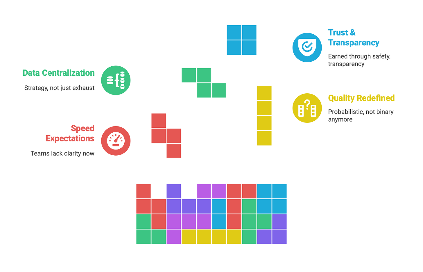 My thesis is simple: generative AI collapsed the distance between intent and implementation. The winners aren’t the ones who “added AI,” but the ones who rebuilt their product craft around four truths. Speed is now table stakes. Quality is probabilistic, not binary. Data is strategy, not exhaust. And trust, earned through transparency and safety, is the only moat that compounds.